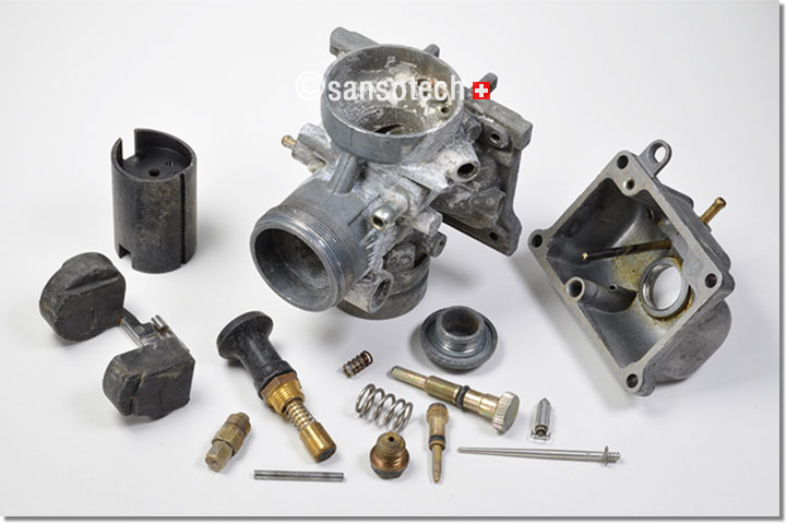 Ob das Reinigungsgut zerlegt oder unzerlegt gereinigt werden kann, hängt von seiner Konstruktion ab. In unserem Beispiel ist der Vergaser als Ganzes ein Hohlkörper. Von der Funktion her muss vor allem das Innere (Kanäle und Düsen) gereinigt werden, das Äussere gerne aus optischen Gründen. Zerlegt bietet er eine bessere Zugänglichkeit für Flüssigkeit und Ultraschall. Zudem muss sichergestellt sein, dass alle Teile komplett entlüftet sind. Und nur in diesem Zustand lässt sich der gelöste Schmutz danach einwandfrei ab- bzw. die Kanäle durchspülen.