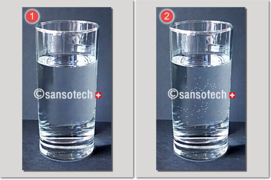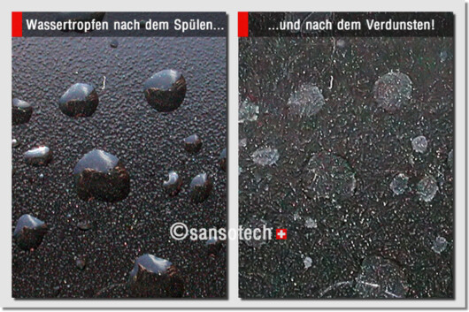 Auch wenn das Wasser klar aus dem Hahn fliesst, enthält es nebst den bereits erwähnten gelösten Gasen auch gelöste Feststoffe wie Mineralien und Salze (z.B. Calcium, Magnesium, Natrium, Chlorid). Lässt man das Restspülwasser auf den Teilen einfach auftrocknen, hinterlässt es seine Inhaltsstoffe als weissliche Flecken.