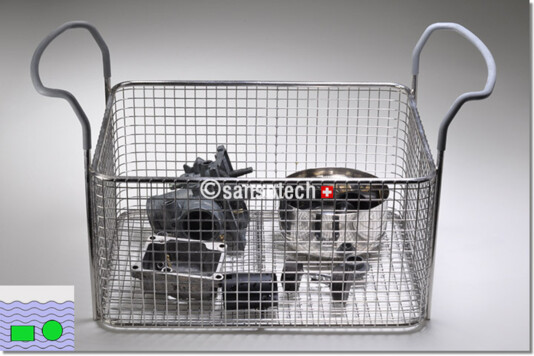 Setzen Sie den Korb ins Bad. Die Teile müssen von der Flüssigkeit vollständig überdeckt sein. Rütteln Sie den Korb etwas, damit allfällig eingeschlossene Luft entweichen kann. Wo sich Luft befindet findet keine Reinigung statt.