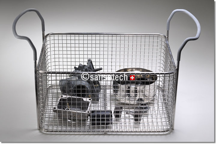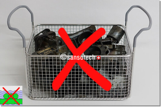 Legen Sie die Vergaserteile mit etwas Abstand nebeneinander in den Korb. Achten Sie darauf, dass die Teile möglichst nicht übereinander liegen. Die Ware kommt so am besten mit Flüssigkeit und Ultraschall in Kontakt. Mit dem neuen modularen Korb und mit Hilfe der Pins und Trennwände lassen sich die Teile einfach positionieren. Alternativ können die Teile ins Bad gehängt werden. Kleinteile wie Düsen, Federn, Schrauben etc. können auch in eine dünnwandige Metallschale gelegt werden.