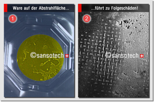Teile auf dem Wanneboden führen zu Reibschäden an Wanne und Ware und zu erhöhtem Kavitationsverschleiss des Wannenbodens.