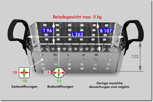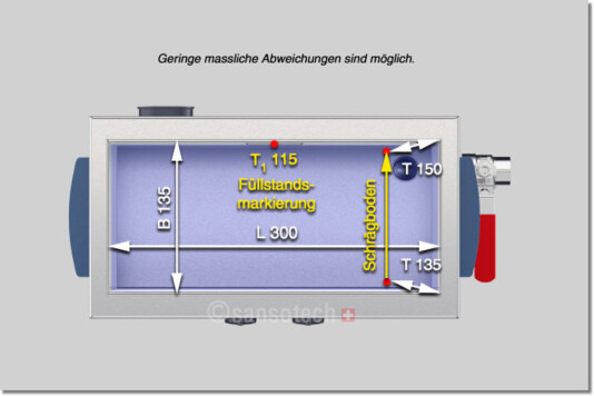 Innenmasse Wanne Länge x Breite x Tiefe ca. | 300 x 135 x 135/150 mm, oben am Rand gemessen, Schrägboden zum besseren Entleeren |